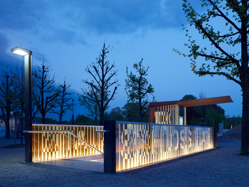 Die Gestaltung des gläsernen Aufzugs und der Brüstung des Treppenaufgangs machen auf die Parkmöglichkeit in der Tiefgarage aufmerksam und schaffen einen wiedererkennbaren Akzent auf dem Schlossplatz. Die teilverspiegelten Gläser verbinden sich harmonisch mit der Umgebung und reflektieren das barocke Umfeld der Schloss- und Parkanlage. Je nach Lichteinfall und Betrachtungswinkel entstehen immer neue Reflexionen, Farbnuancen und Facetten. Das natürliche Tageslicht und die ab Dämmerung zugeschaltete Beleuchtung verändern das optische Erscheinungsbild der behandelten Glasflächen und erzeugen eine variantenreiche Wechselwirkung zwischen verspiegeltem Schriftbild und Umgebung.