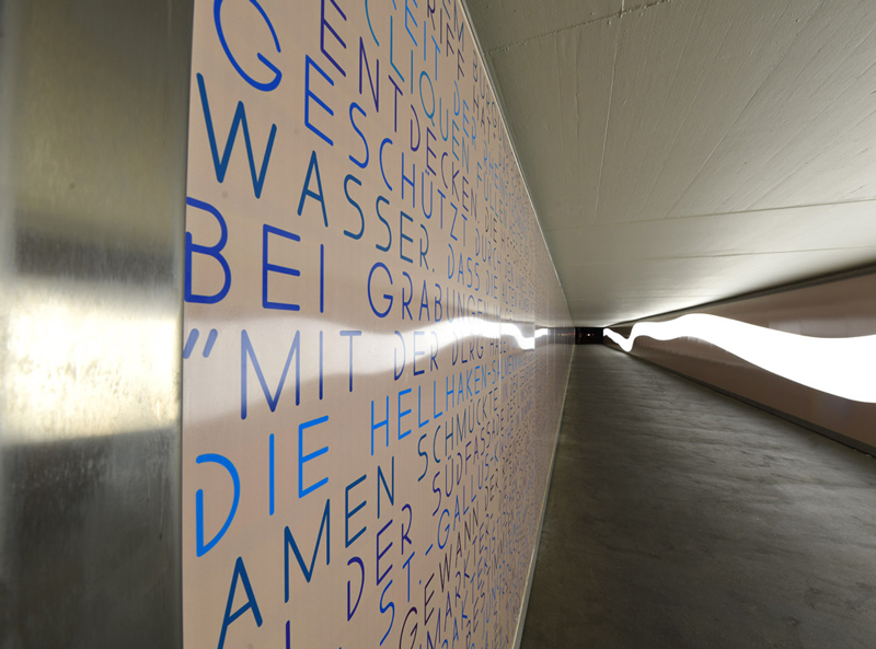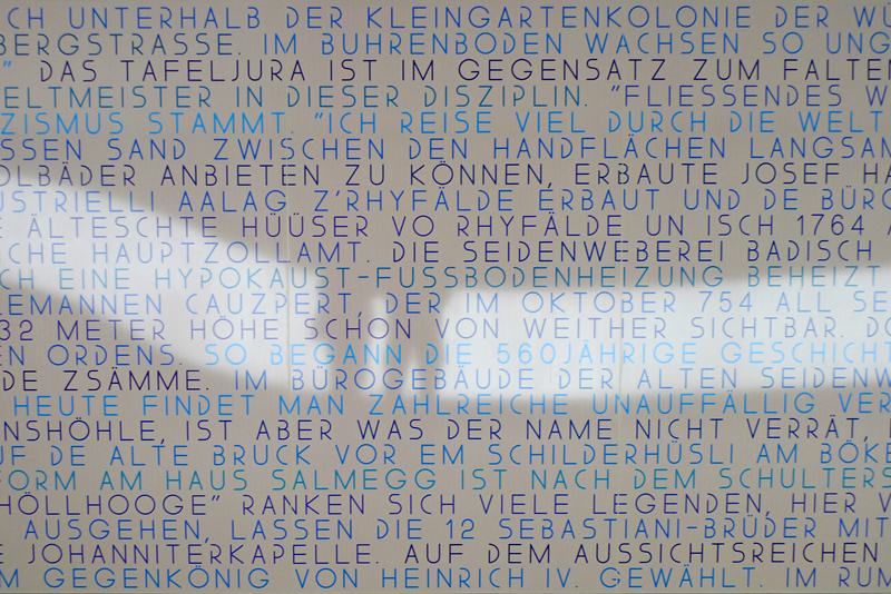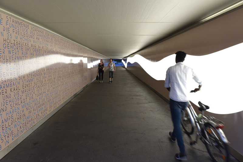 Eine Seite des 60 m langen Tunnels zeichnet daher wie in einem erleuchteten Scherenschnitt silhouettenhaft abstrahiert den Verlauf des Stromes im Rheinfelder Abschnitt nach. Die gegenüberliegende Tunnelwand hingegen ist der Geschichte und den Geschichten des Rheins gewidmet. In den Texten, die sich hier zusammenfügen, »erzählt« der Fluss Begebenheiten und Legenden und weist auf Sehenswürdigkeiten und Kuriositäten zu beiden Seiten des Ufers hin. Neben den sich eröffnenden gestalterisch-atmosphärischen Möglichkeiten konnte damit auch funktionalen Sicherheitsaspekten Rechnung getragen werden, da der Raum hell und gleichmäßig ausgeleuchtet wird. Die Schemen der querenden Fußgänger und Radfahrer, die durch das Lichtband auf die Textwand geworfen werden sind Teil der Inszenierung. So tauchen die Passanten buchstäblich in den Rheinfelder Geschichtsfluss ein und werden Teil jener Geschichten die der Fluss erzählt.