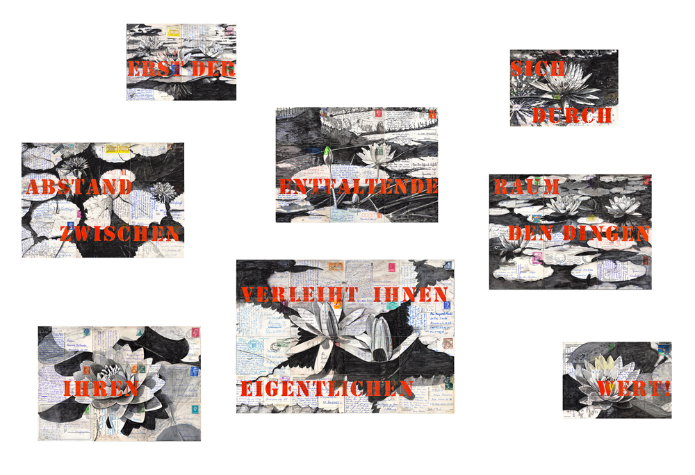 Die Arbeit entstand während des ersten Corona-Lockdowns. 8 Bildtafeln sind so angeordnet, dass der rote Schriftzug zeilenweise von Bild zu Bild gelesen werden kann: